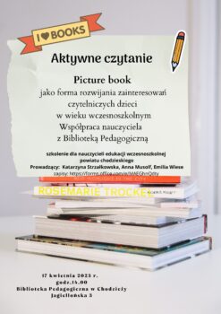 Dnia 17 kwietnia 2023 r. w Bibliotece Pedagogicznej w Chodzieży przy ul. Jagiellońskiej 3 o godz.14.00 organizujemy szkolenie dla nauczycieli nauczania wczesnoszkolnego "Aktywne czytanie - Picture book jako forma rozwijania zainteresowań …