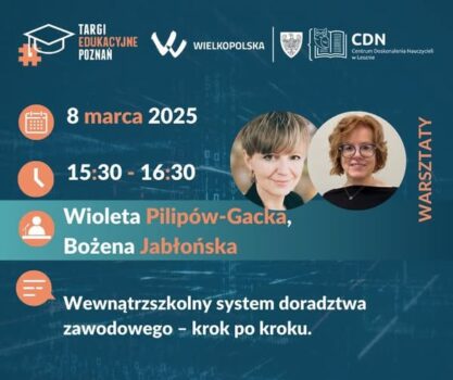 8 marca 2025 r. /sobota/ podczas Targów Edukacyjnych w Poznaniu odbędą się warsztaty : "Wewnątrzszkolny system doradztwa zawodowego - krok po kroku." Warsztaty poprowadzą Bożena Jabłońska i Wioleta Pilipów-Gacka z Centrum Doskonalenia Nauczycieli w Pile.