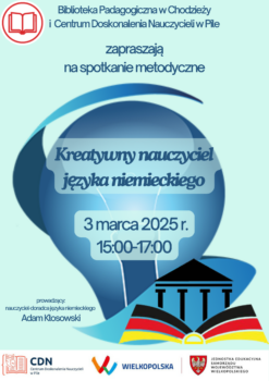 3 marca 2025 r. (poniedziałek) w godz. 15.00 - 17.00 w Bibliotece Pedagogicznej w Chodzieży odbędzie się spotkanie metodyczne dla nauczycieli języka niemieckiego z powiatu chodzieskiego. Spotkanie poprowadzi nauczyciel-doradca języka niemieckiego p. Adam Kłosowski.